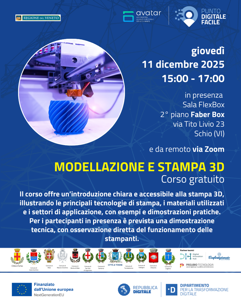 L’incontro è dedicato a tutti coloro che desiderano comprendere le basi della stampa 3D, una tecnologia che sta rivoluzionando processi creativi, produttivi e progettuali in diversi settori. Dalla prototipazione veloce al design, dall’artigianato alla piccola produzione, la stampa 3D offre nuove opportunità anche per chi si avvicina per la prima volta al mondo della fabbricazione digitale.