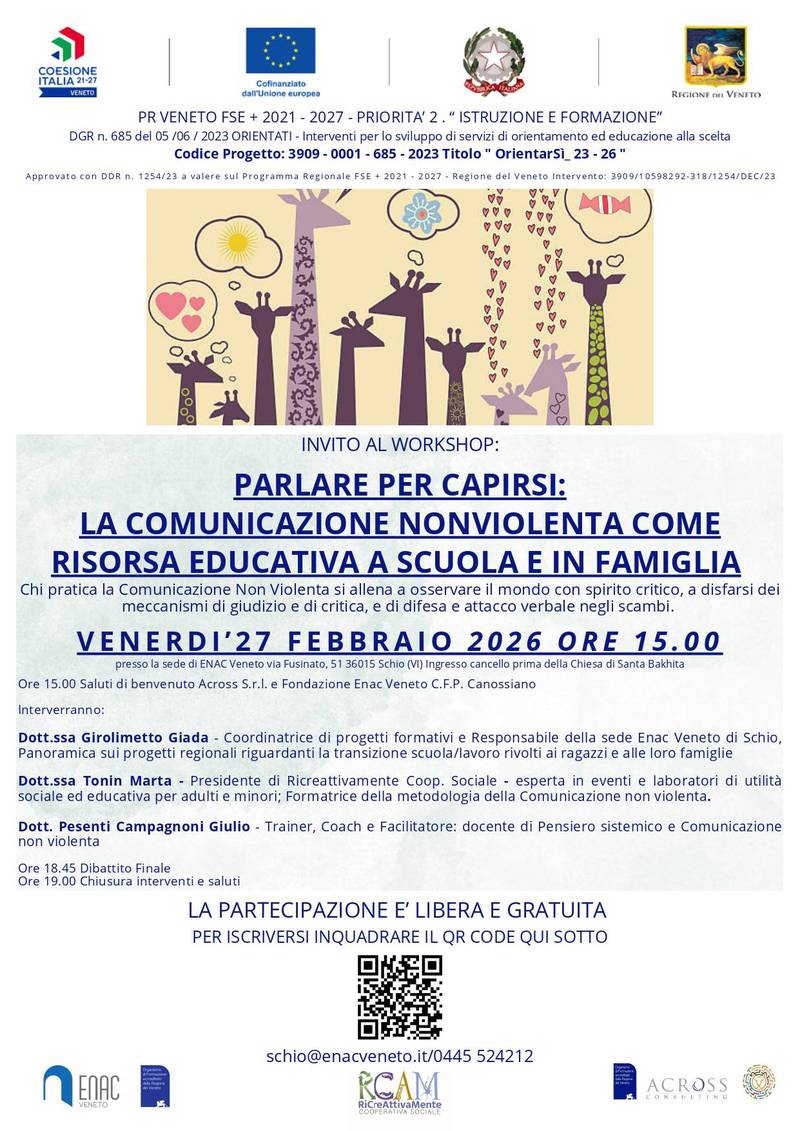 Workshop gratuito organizzato da ENAC Veneto sul tema della comunicazione non violenta rivolto ai genitori di adolescenti ma anche a operatori, educatori, insegnanti e più in generale a tutti coloro che interagiscono con studenti e giovani.