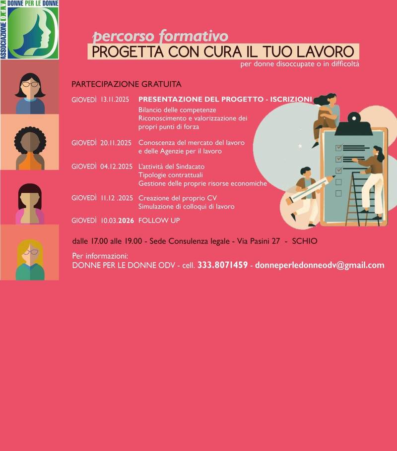 L’associazione Donne per le Donne ODV organizza un percorso formativo gratuito dedicato a donne disoccupate o in difficoltà, con l’obiettivo di fornire strumenti pratici per valorizzare le proprie competenze e affrontare con consapevolezza il mercato del lavoro.