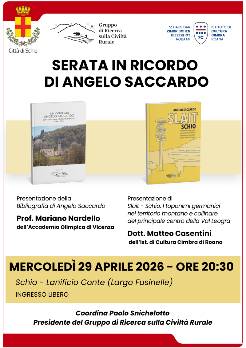 e presentazione di "Slait-Schio", i toponomi germanici nel territorio montano e collinare del principale centro della Val Leogra, con il dott. Matteo Casentini (Ist. di Cultura Cimbra di Roana).