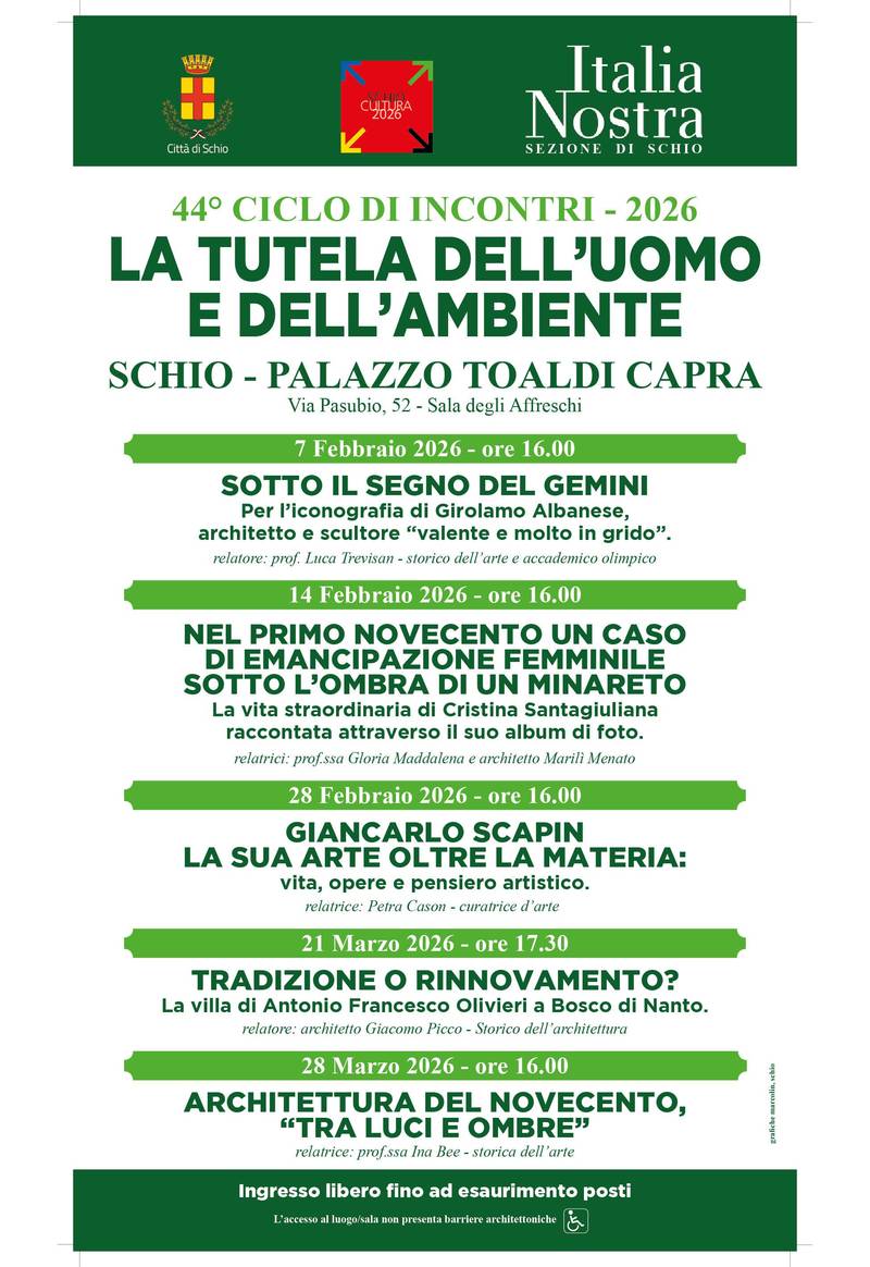 Italia Nostra Sezione di Schio propone un percorso di approfondimento che mette al centro il patrimonio artistico, architettonico e umano del territorio. Attraverso il contributo di esperti e studiosi, l'iniziativa punta a sensibilizzare la cittadinanza sulla storia e sulla bellezza locale come strumenti di crescita e tutela culturale.