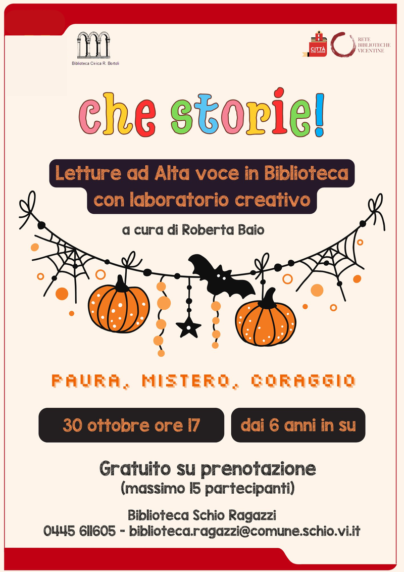 Prenotazione obbligatoria (massimo 15 partecipanti) chiamando il numero 0445 611605 o tramite mail a biblioteca.ragazzi@comune.schio.vi.it