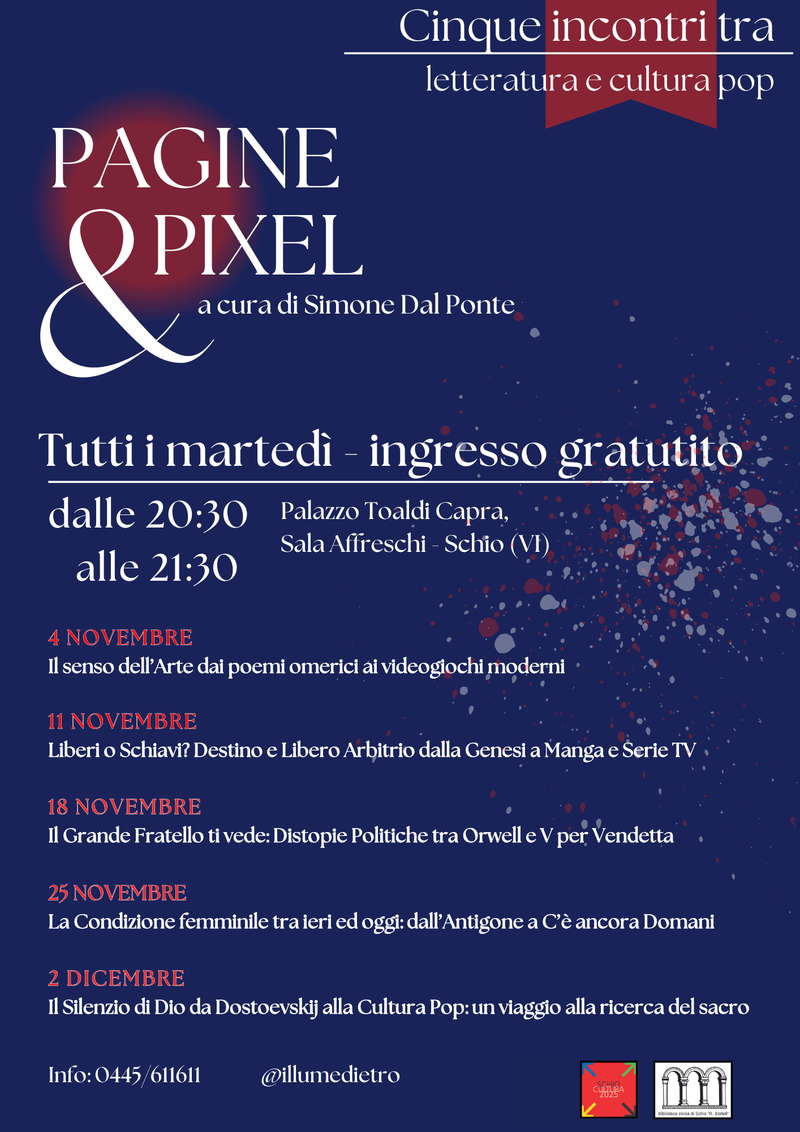 Curata da Simone Dal Ponte, la rassegna "Pagine & Pixel" propone riflessioni originali e provocatorie su temi universali come arte, libertà, identità, e società, esplorati attraverso testi classici, manga, videogiochi, serie TV e molto altro.