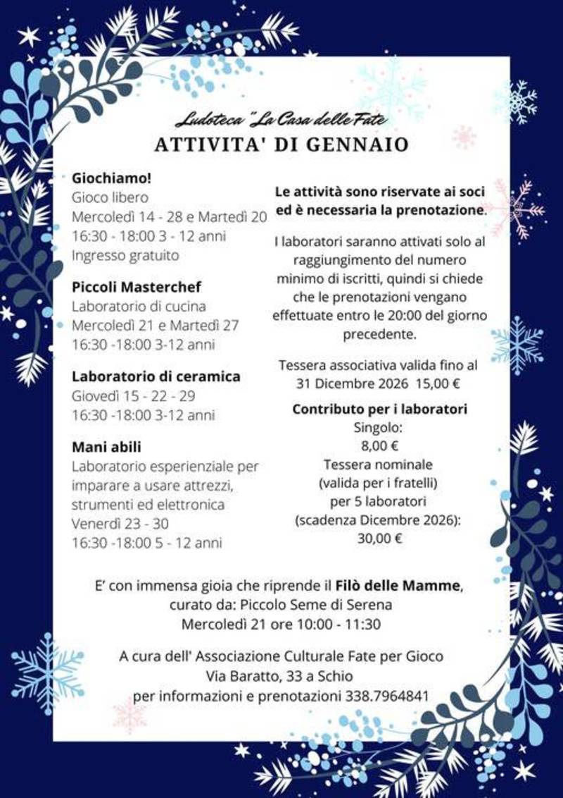 Il contributo per un singolo laboratorio è di 8€. Abbonamento da 5 laboratori - €30 valido anche per i fratelli