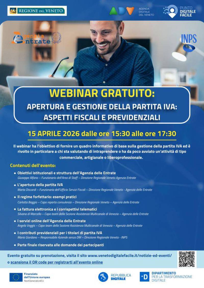 Il webinar ha l’obiettivo di fornire un quadro informativo di base sulla gestione della partita IVA ed è rivolto in particolare a chi sta valutando di intraprendere o ha da poco avviato un’attività di tipo commerciale, artigianale o libero professionale.