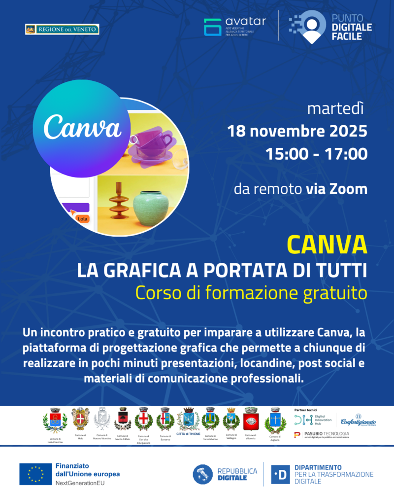 Durante il corso verranno illustrate le funzionalità principali dello strumento, i modelli preimpostati e la creazione di contenuti personalizzati, con esempi di applicazione per il lavoro, la scuola, la promozione di attività o eventi e la comunicazione quotidiana sui social media.
