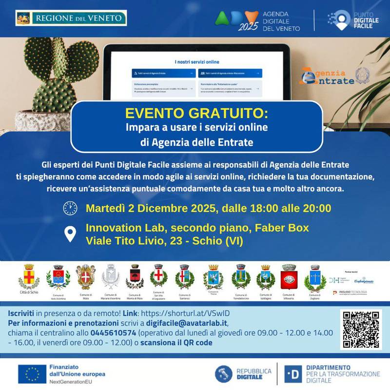 L‘obiettivo dell’incontro, in presenza e online, è supportare i cittadini nell'utilizzo dei servizi online dell'Agenzia delle Entrate.