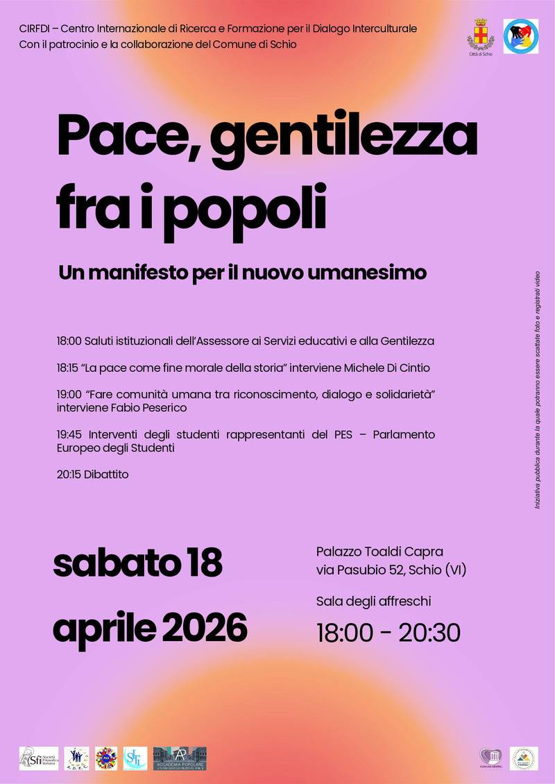 Ad aprire l’incontro i saluti istituzionali, seguiti dagli interventi di Michele Di Cintio, sul tema della pace come orizzonte etico, e di Fabio Peserico, che approfondirà il valore della comunità umana tra dialogo e solidarietà. Spazio anche ai contributi degli studenti del Parlamento Europeo degli Studenti e a un momento di dibattito aperto al pubblico.