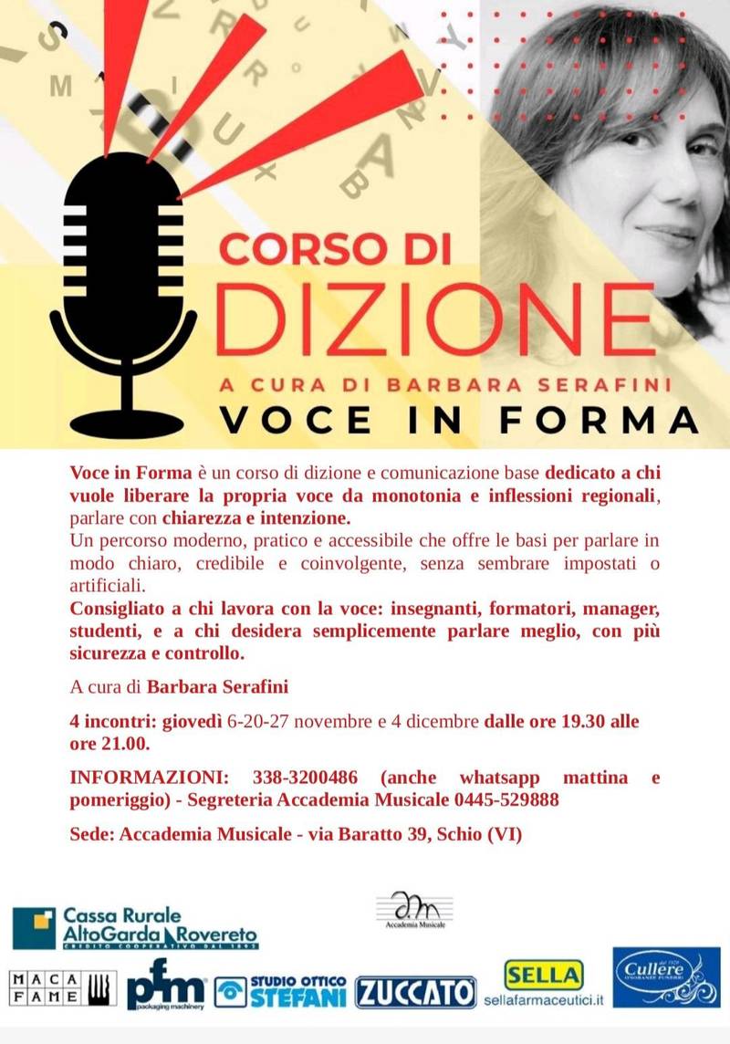 "Voce in Forma" è un corso di dizione e comunicazione base dedicato a chi vuole liberare la propria voce da monotonia e inflessioni regionali, parlando con chiarezza e intenzione.