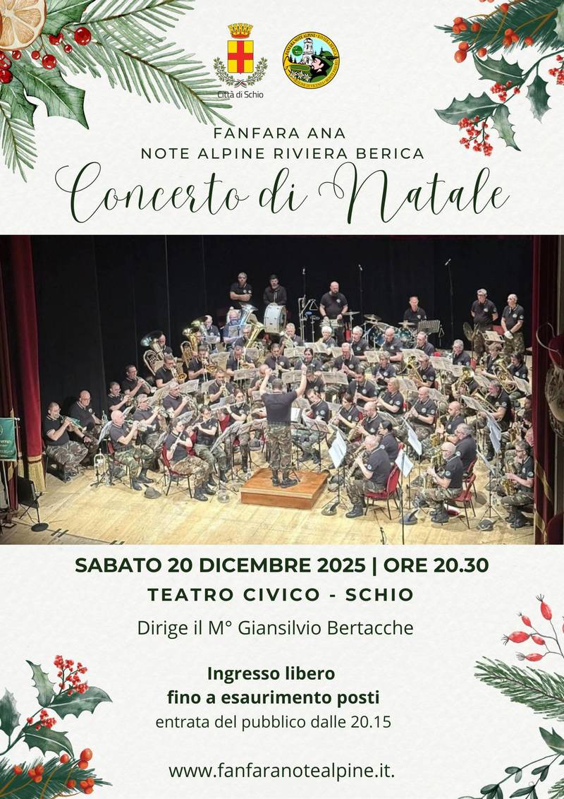 La Fanfara ANA Note Alpine Riviera Berica si esibisce per il suo annuale concerto di Natale. La formazione, diretta dal M° Giansilvio Bertacche, propone un repertorio diversificato che unisce le tradizioni alpine e militari alla musica bandistica italiana e internazionale.