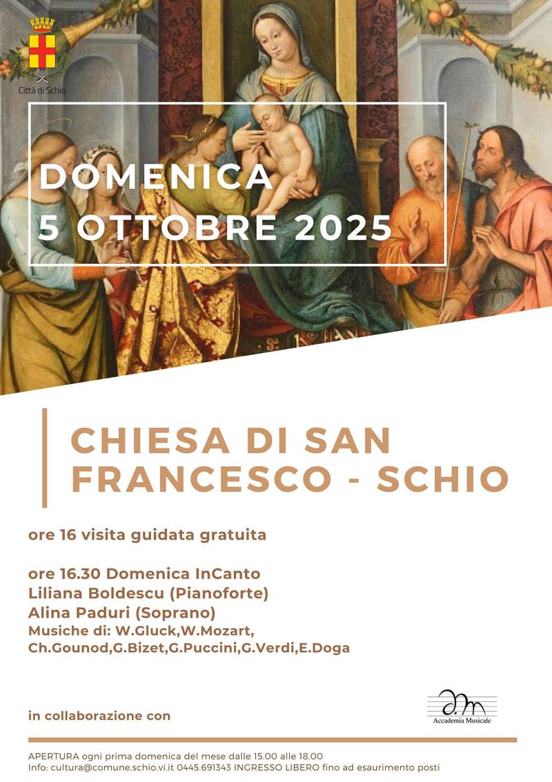 Un pomeriggio dedicato alla bellezza, tra arte sacra e grandi capolavori musicali. La Chiesa di San Francesco apre le sue porte per una visita guidata alle ore 16:00, seguita dal concerto Domenica InCanto alle 16:30, con: