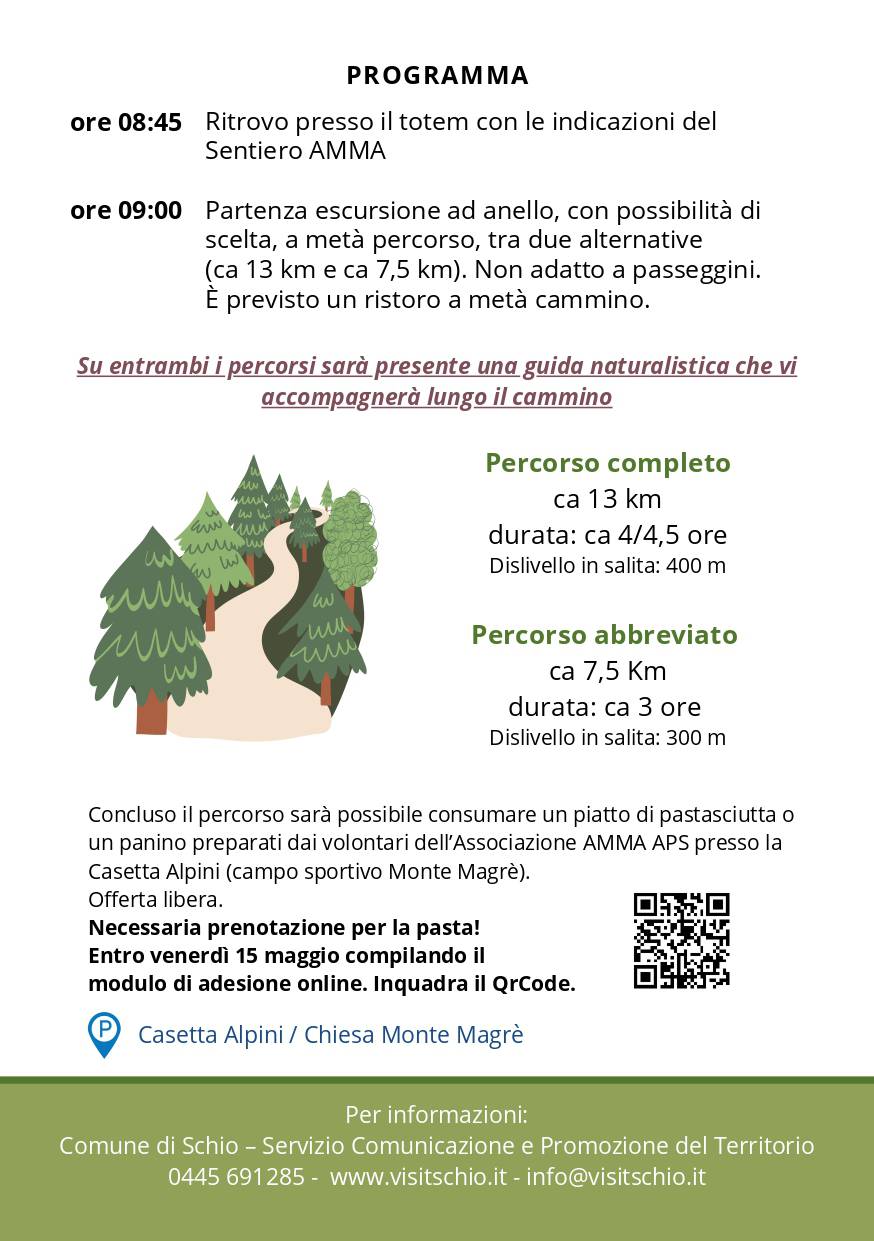 Concluso il percorso sarà possibile consumare un piatto di pastasciutta o panino preparati dai soci AMMA APS presso la Casetta Alpini (campo sportivo Monte Magrè). Offerta libera.