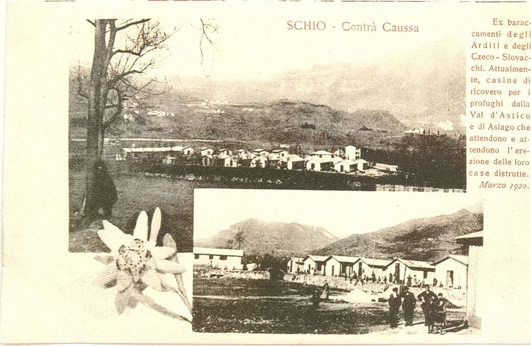 L’esodo fu una conseguenza diretta della Strafexpedition del maggio 1916, quando l’esercito austroungarico attaccò le linee italiane e, in pochi giorni, raggiunse Asiago occupando l’intera conca, giungendo fino a Velo d’Astico, risalendo poi il Priaforà. La popolazione dell’Altopiano fu costretta ad abbandonare le proprie case e a dirigersi verso la pianura, portando con sé quanto era possibile salvare, in condizioni di profonda disperazione. Una parte significativa di questi profughi giunse a Schio, dove l’Autorità militare avviò, tra la tarda estate e l’inizio dell’autunno del 1916, la costruzione di baracche destinate a fungere da primo e precario luogo di accoglienza, in attesa di un ritorno che, per molti, sarebbe stato reso impossibile dalla distruzione delle abitazioni d’origine. Furono circa 700 gli sfollati provenienti da Velo d’Astico, Arsiero e Posina, persone prive di un tetto e bisognose di sostentamento.